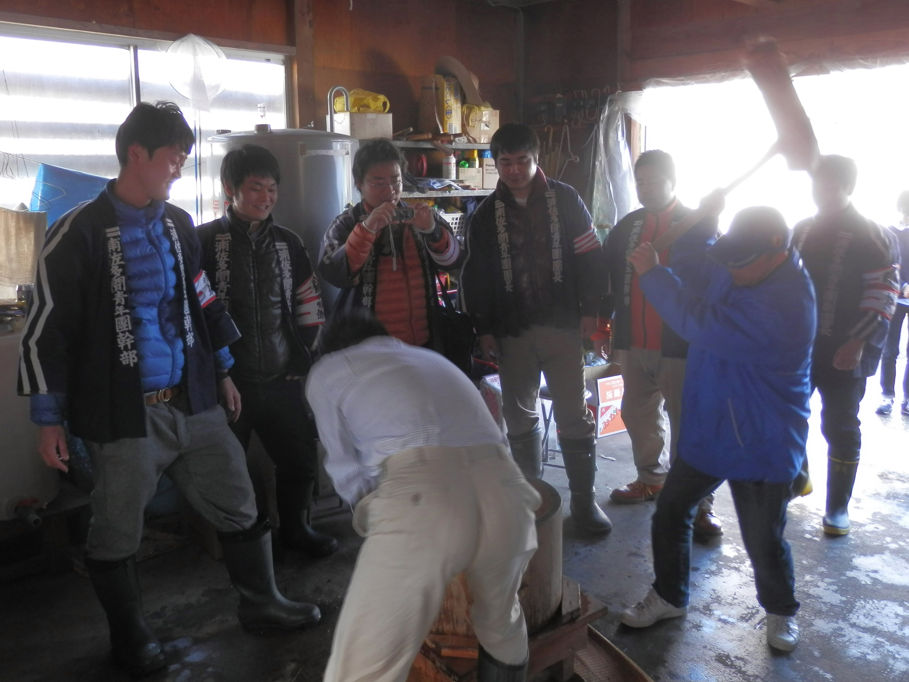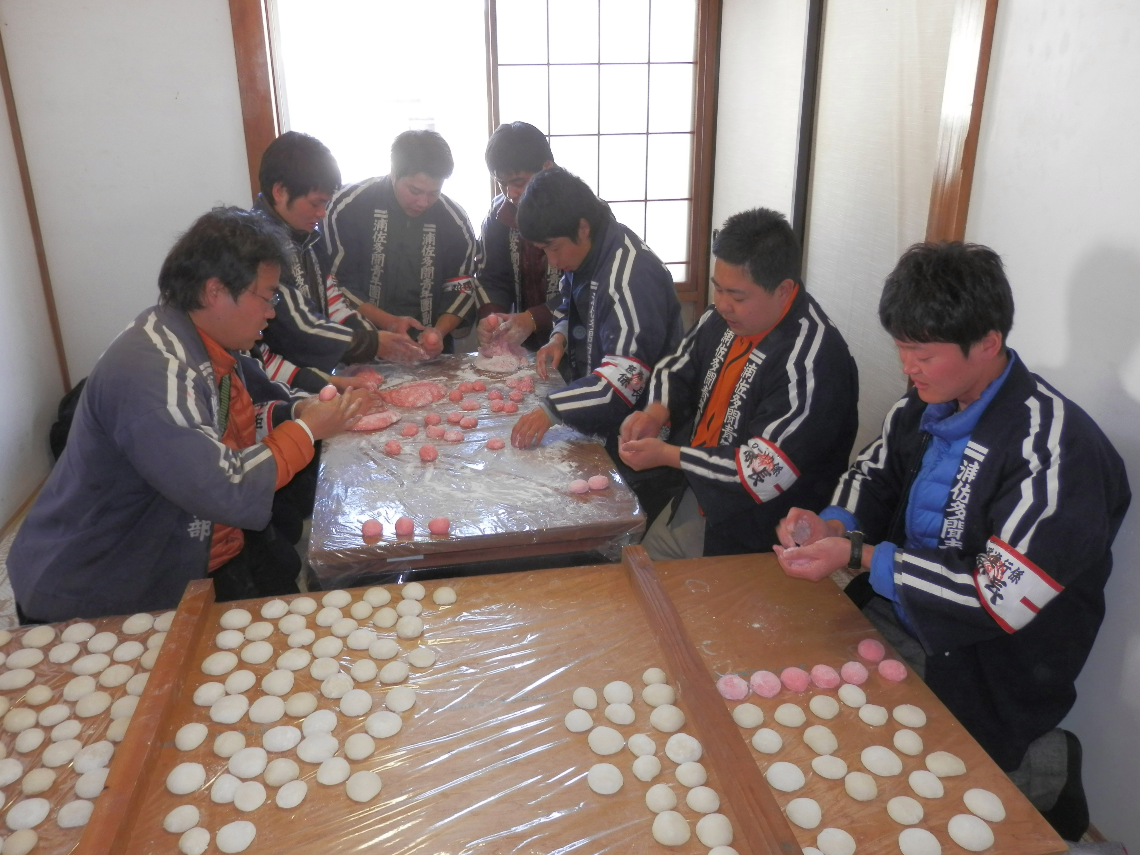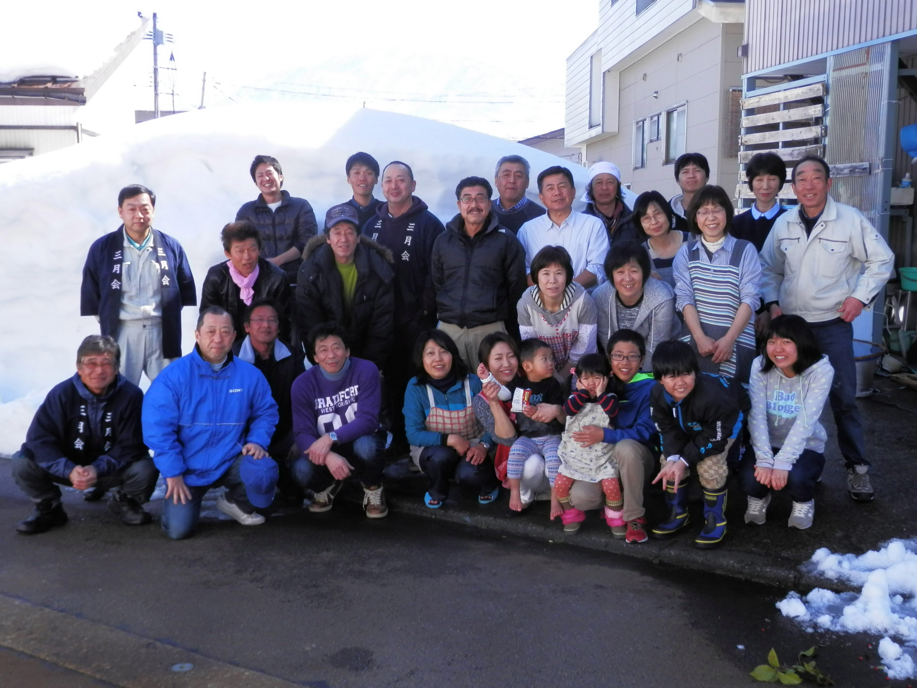 三月会活動について 地元の同級生で構成されています。 毎年、下記の写真のようにお餅を搗いて福餅撒与の餅撒きに参加しました。 尚、餅つきは還暦を最後に終了しました。 平成27年の餅つきです 多聞青年団最高幹部の方たちがお手伝いに来てくれました 色は紅白のみですが形のバリエーションは多いです (^^ゞ この後慰労会会場へ移動します (~_~;)